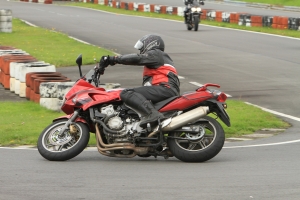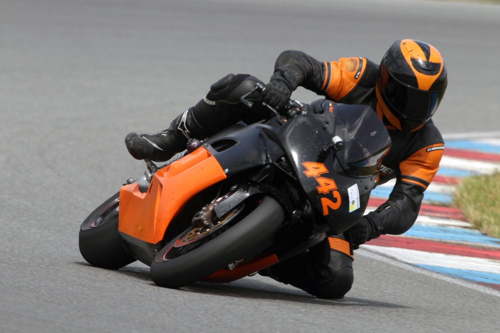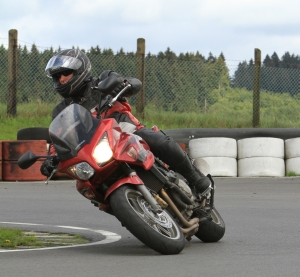 Jeder bockte an einer anderen Stelle, keiner war perfekt, jeder hatte gehörigen Respekt vor den Fähigkeiten des anderen... mit dabei ein Instruktor, der nach jedem Turn (es gab insgesamt sieben à 25 Minuten) zunächst die groteskesten Linienfehler auf Video gezeigt hat - nein, man wurde nicht vorgeführt! Sehr konstruktiv, sehr angenehm - vielleicht hätte das sogar noch etwas böser sein dürfen. Später wurde dann von jedem eine komplette Runde gezeigt und es wurde deutlich, dass jeder den Kurs zunehmend kennt und sich auch an den richtigen Stellen mehr traut als anfangs. Da jeder natürlich auch bei der Runde dabei war und hinterherfuhr, die ein anderes Gruppenmitglied anführte, konnte man sehr schön die Lernkurve über das gesamte Team beobachten. Und es blieb bis zum Ende so, dass wir uns weitestgehend synchron entwickelt haben. Und das auf völlig verschiedenen Moppeds... R1200R, KTM 990, Streety, Buell (jetzt frag mich aber keiner was für eine), CB 1300 und die Dicke. So verschieden die Geräte, so ähnlich doch bei allen der Vorsatz die Fuhre einigermaßen elegant, entspannt und trotzdem schnell um die Ecken zu bringen.
