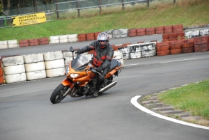 Gruppenstrategie war zunächst zwei Turns hinter dem Instruktor durchzuwechseln. Später wechselte jeweils für eine Runde der Fahrer hinter dem Instruktor nach ganz vorne (und wurde dort auf viedeo aufgezeichnet) und anschließend ganz nach hinten. Geil! Wie man sich vertun kann, wenn man selbst die Linie sucht - und der Kurs hat ein paar Gemeinheiten, die einem jeden Anflug von Ungeduld und Übermut umgehend abstrafen.